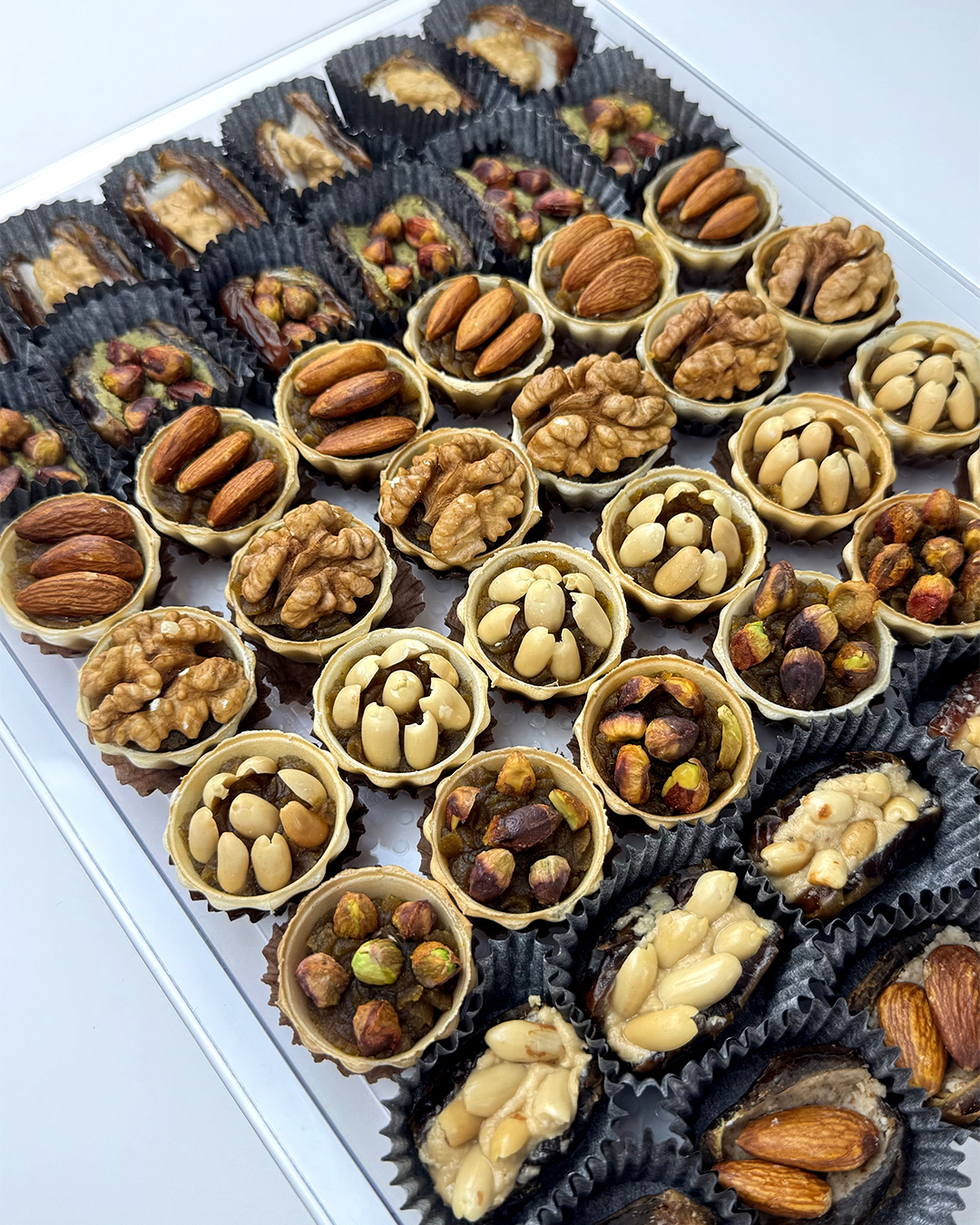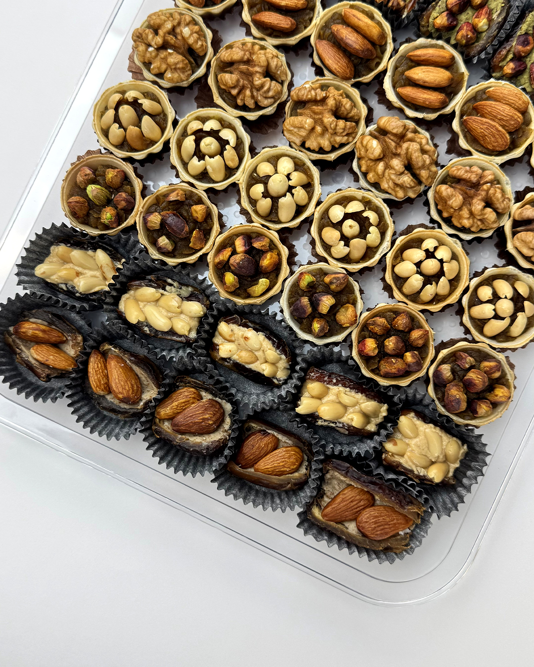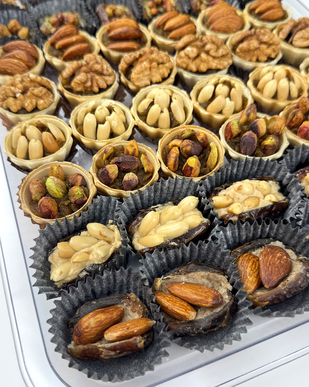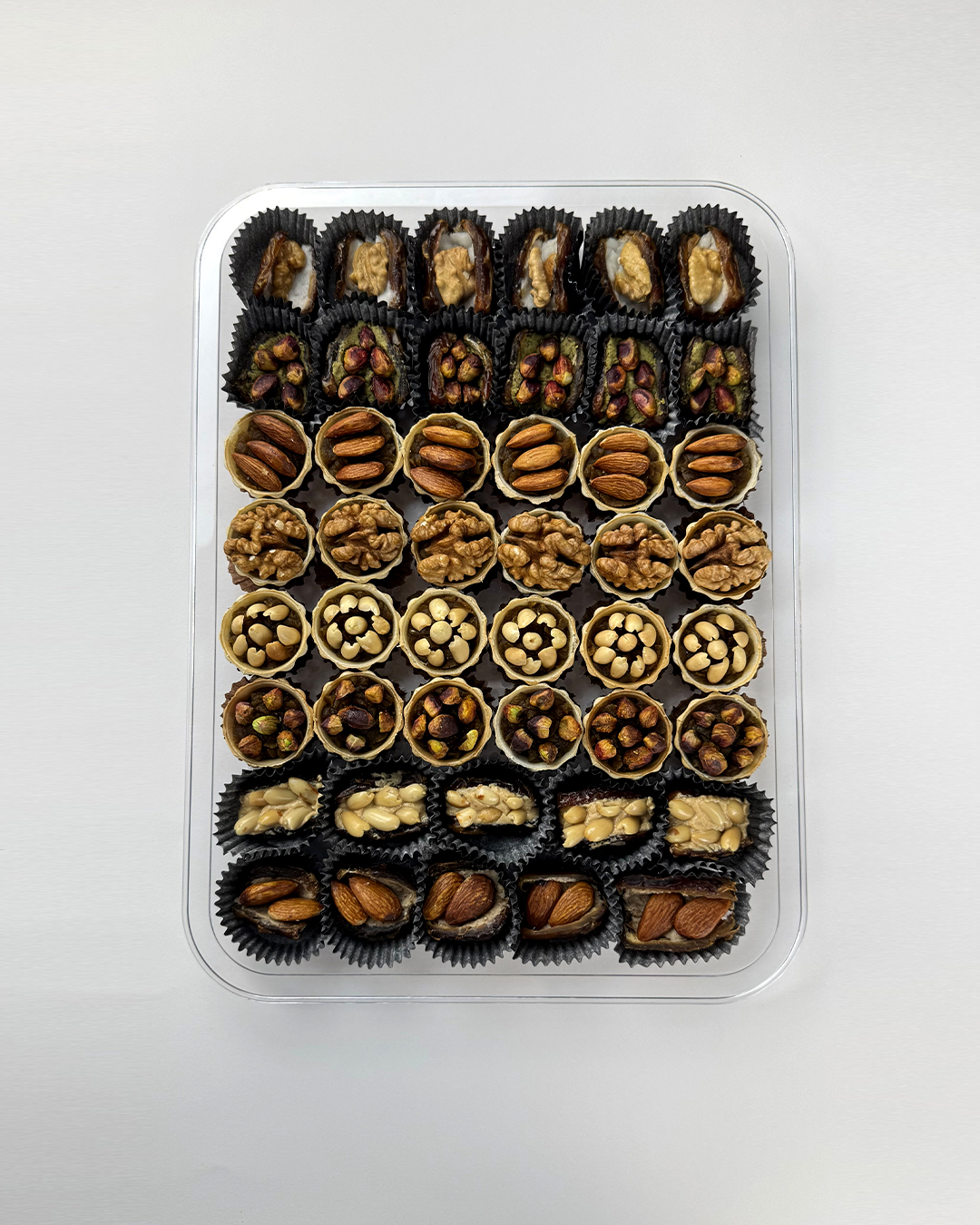 خرما پیارم و حلوای پر شده با کره و مغز با چهار طعم گردو ٫پسته٫بادام ٫ بادامزمینی : ۴۸ عدد خرما و حلوا با کره و مغز های متفاوت