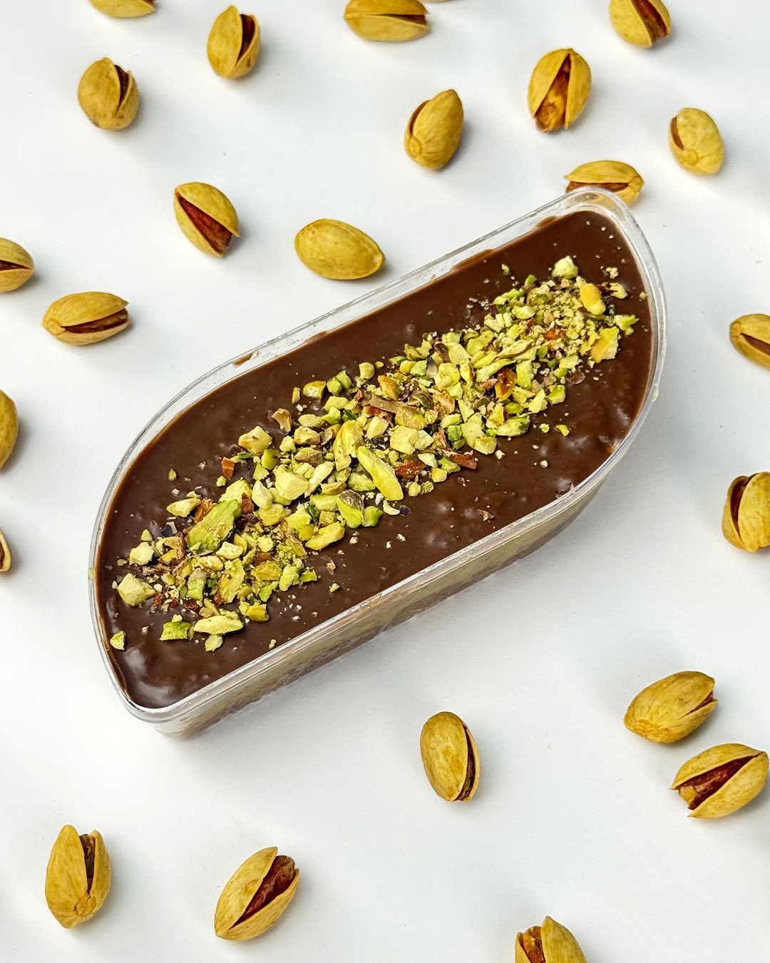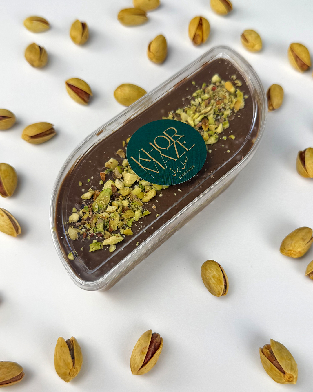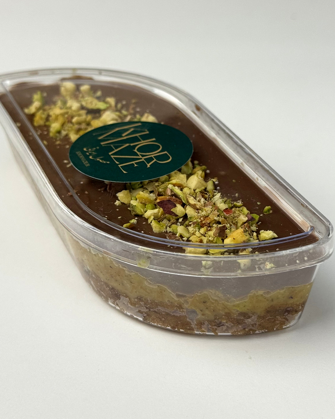 خرمای چرخ شده یک لایه رشته کاتاف با کره پسته یک لای و یک لای شکلات و مغز پسته روش : ۱ پک تک نفره